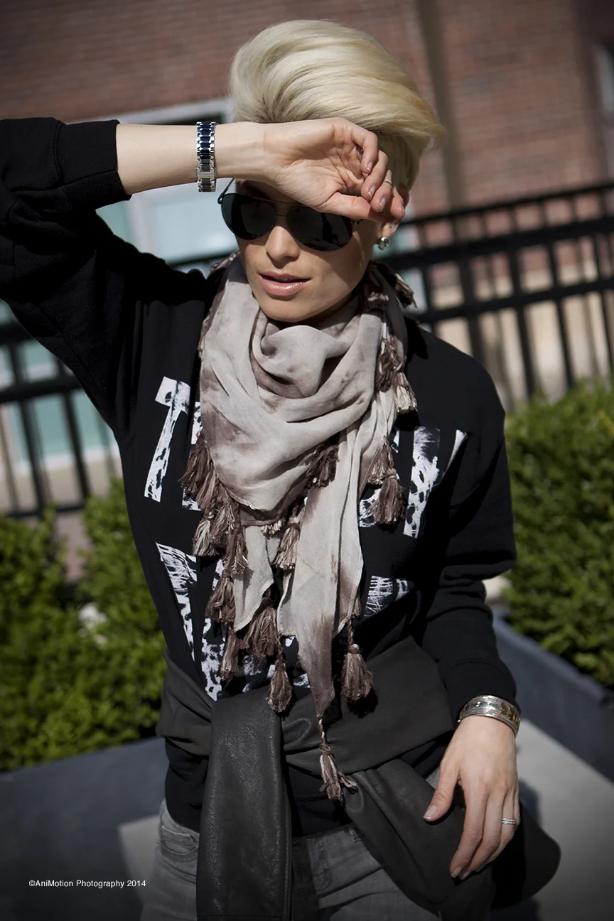 Jacket from Diesel/ Sweater from River Island/ Jeans from Genetic Denim/ Shoes and earrings from C Wonder Store/ Bangle and scarf from vintage shopping/ Watch from Tag Heuer.